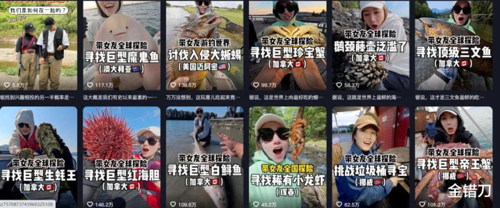 原本主攻钓鱼的大豪夫妇,也从全国钓鱼转向“全球探险”,其视频横跨海钓界、旅游界和吃播界,其中小龙虾、帝王蟹、三文鱼、巨型生蚝等高端海鲜泛滥系列,几乎条条百万点赞。