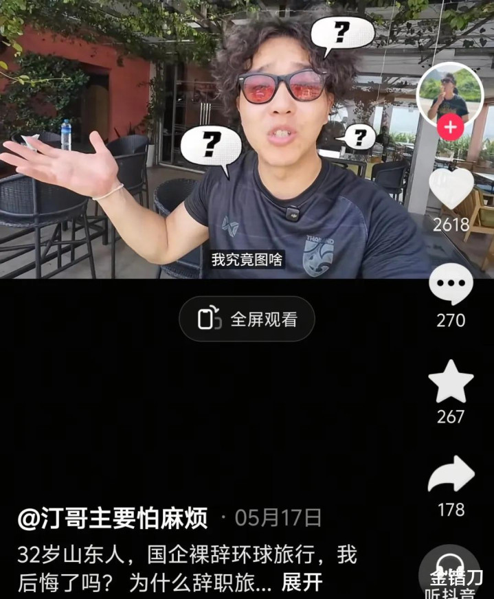 在短视频平台,裸辞当旅行博主后奔向自由的爽文数不胜数,吸引了不少在工位煎熬的社畜。